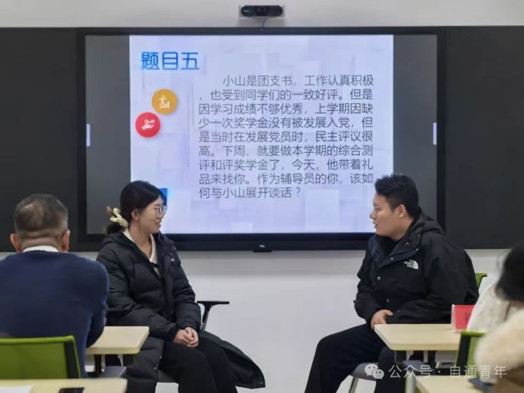 谈心谈话环节,我系董钊睿老师、刘福志老师以及计算机系王晓琳老师分别针对学生评奖评优、深陷网络贷款、班级建设与学生干部管理等典型案例展开精彩纷呈的谈心谈话。用他们细致的洞察力和耐心的态度把握和引导同学们,帮助他们解决实际问题。展现了辅导员在学生日常管理工作中的专业素养和人文关怀,给大家留下了深刻印象。