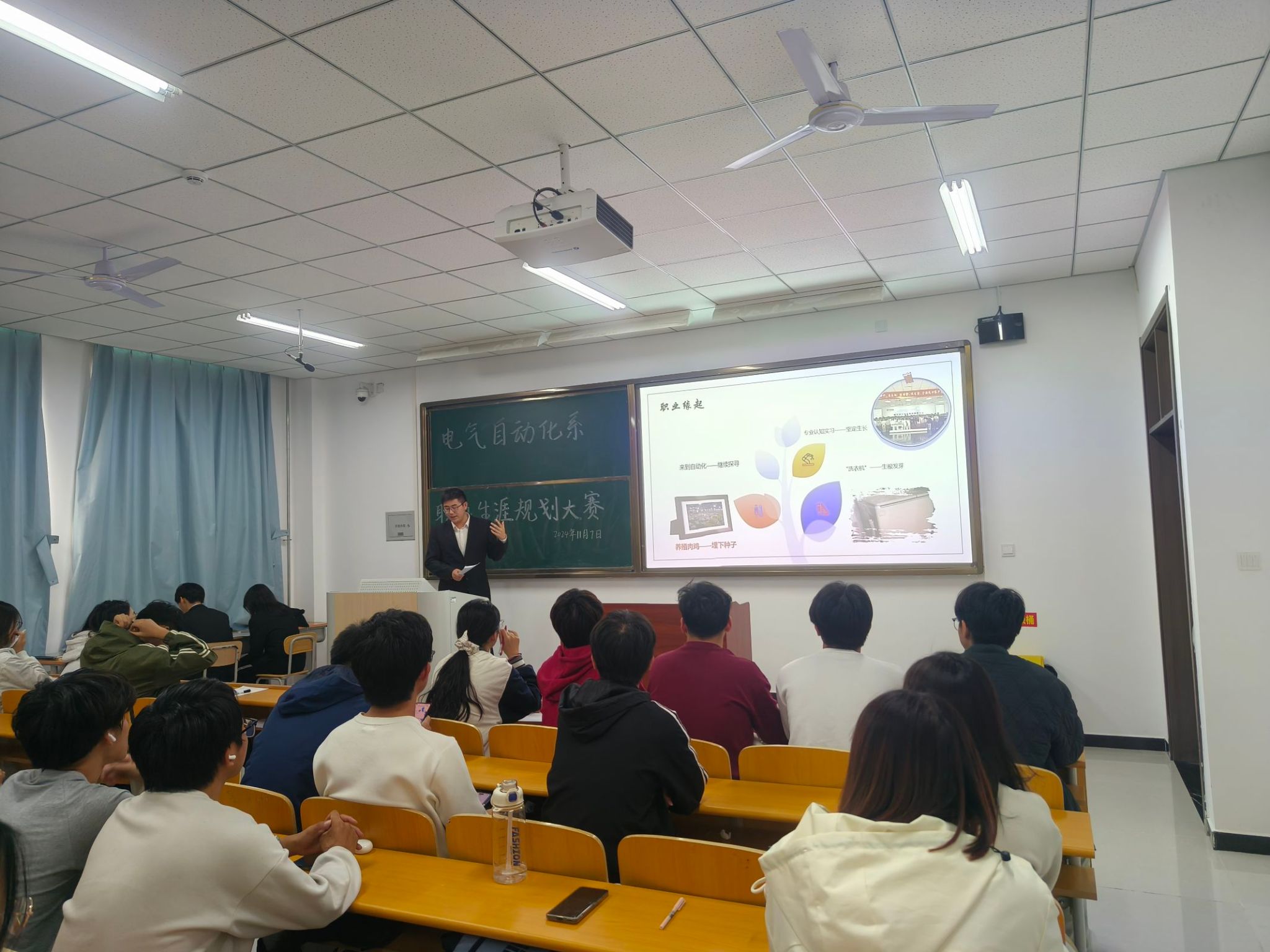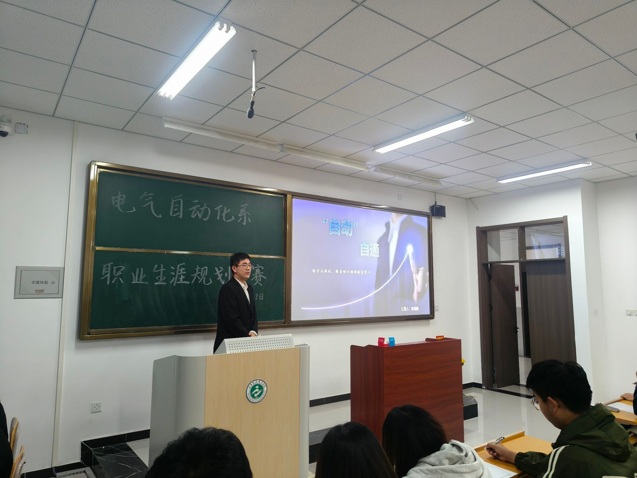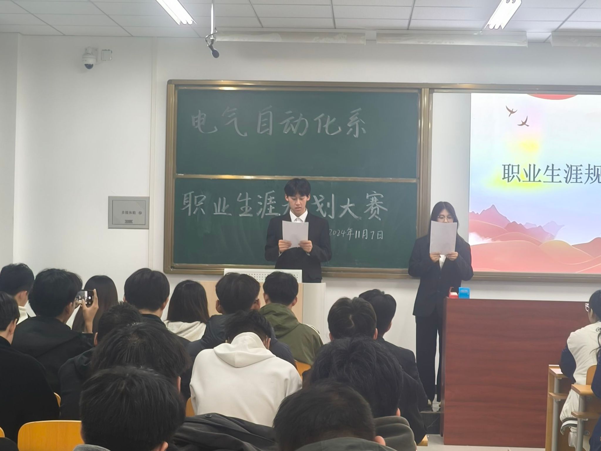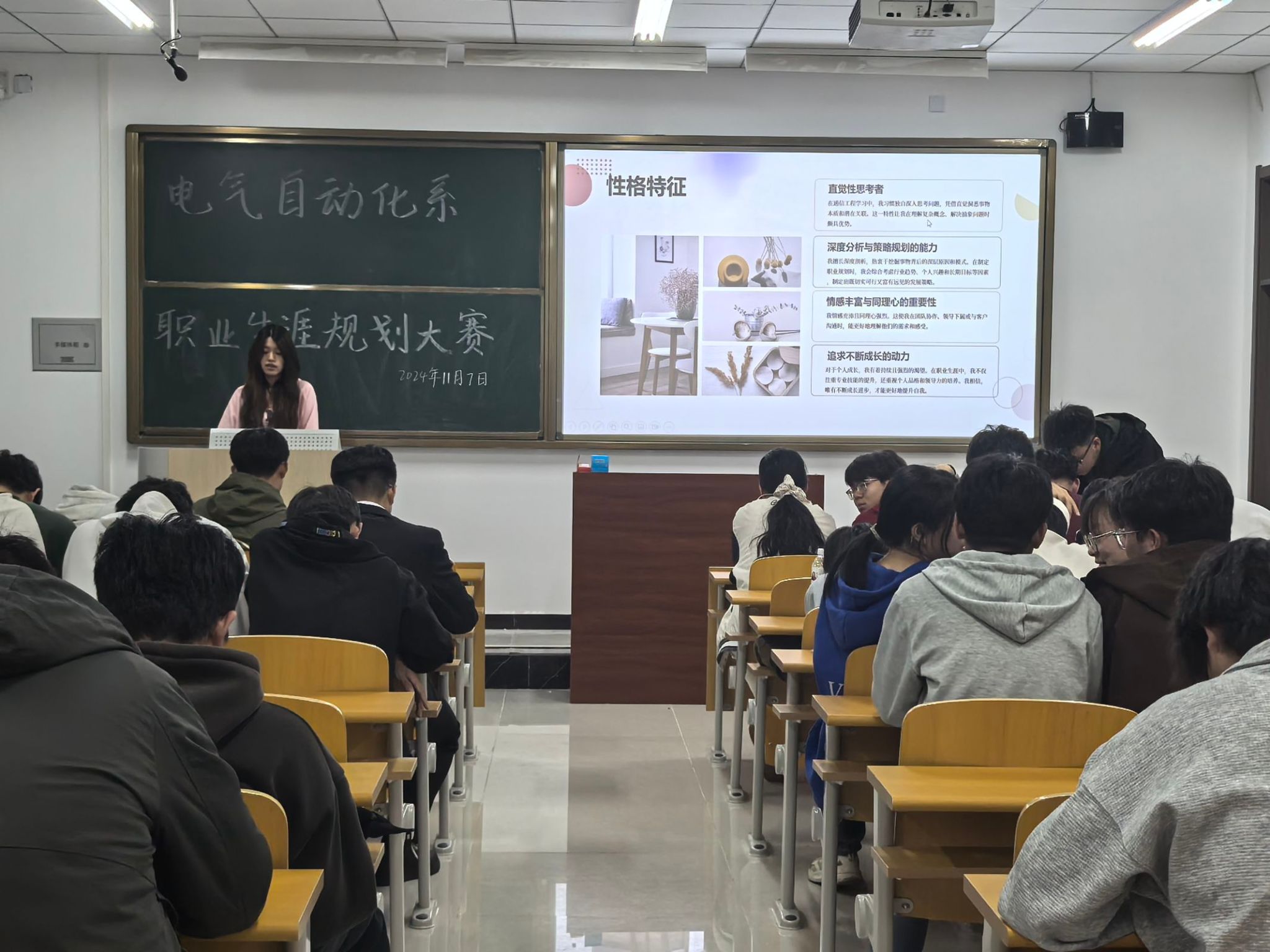 比赛过程中,参赛选手依次上台,结合策划书与PPT演示文稿,从自身实际情况出发,对个人职业生涯的主观条件进行测评、分析与总结。同学们结合时代特点与专业能力,立足当下,展望未来,确定最佳的职业奋斗目标,并为这一目标做出详细的规划与安排。