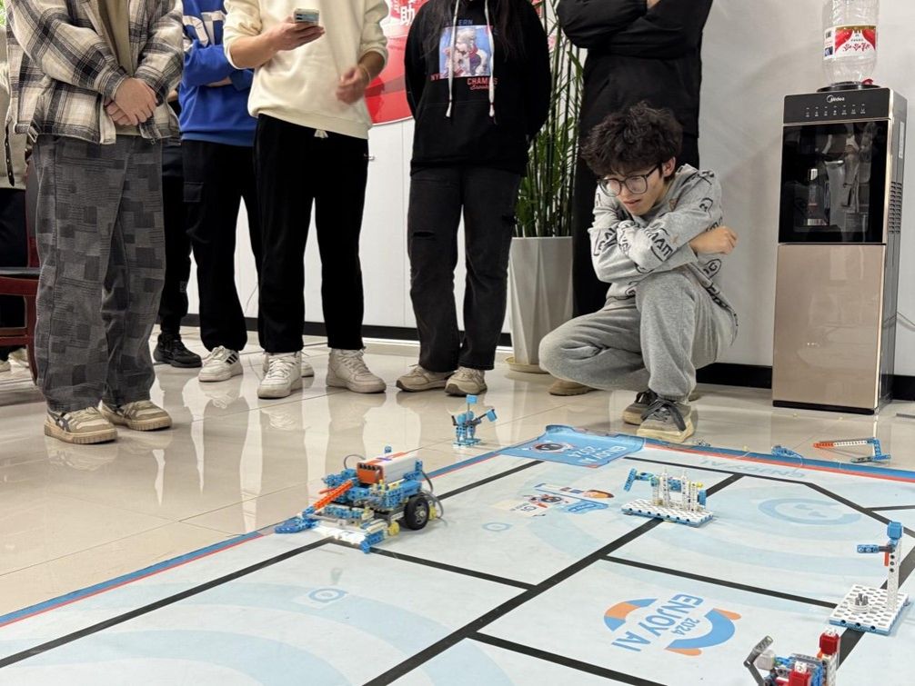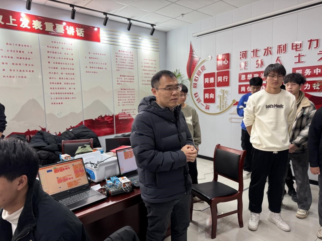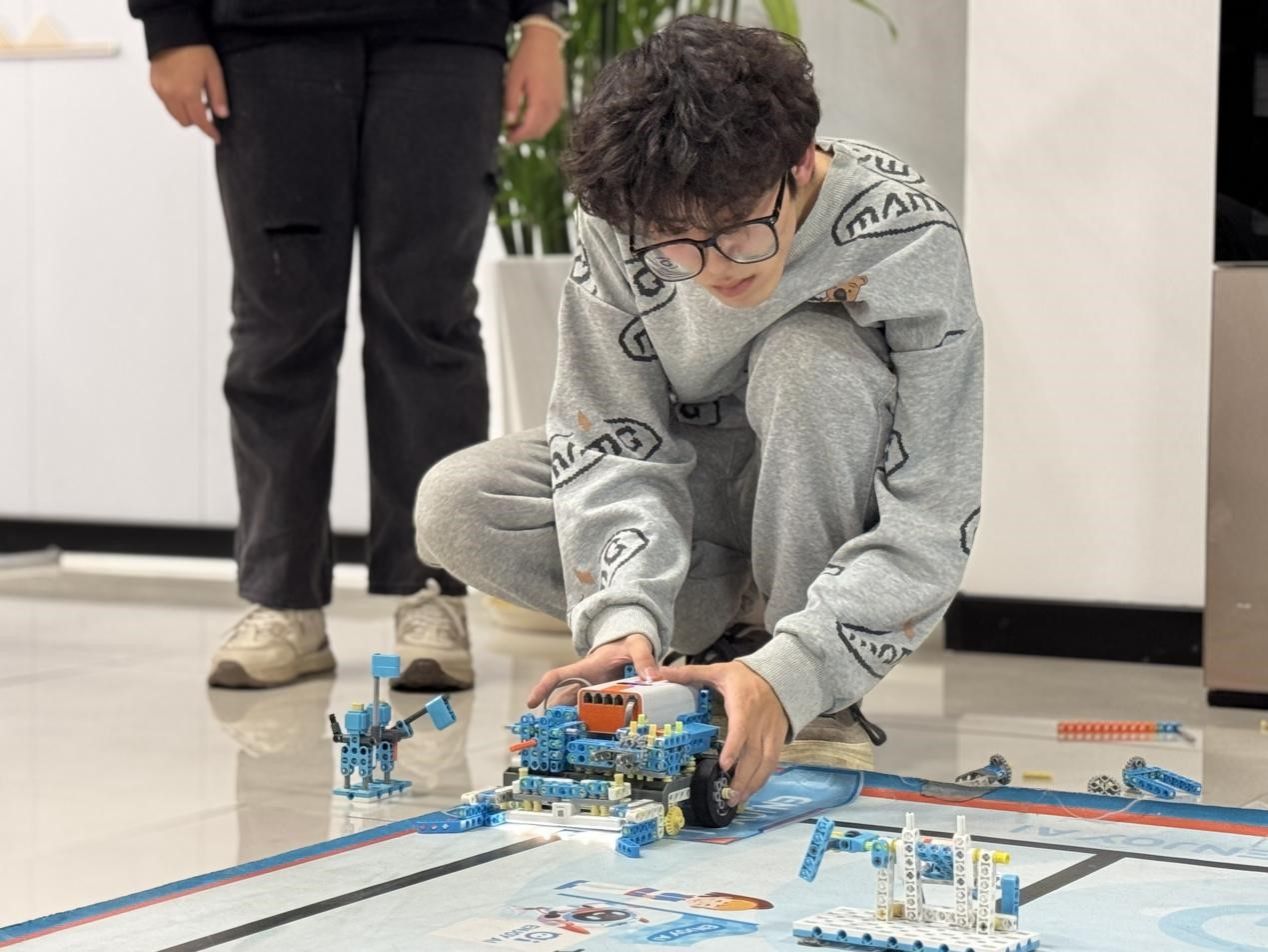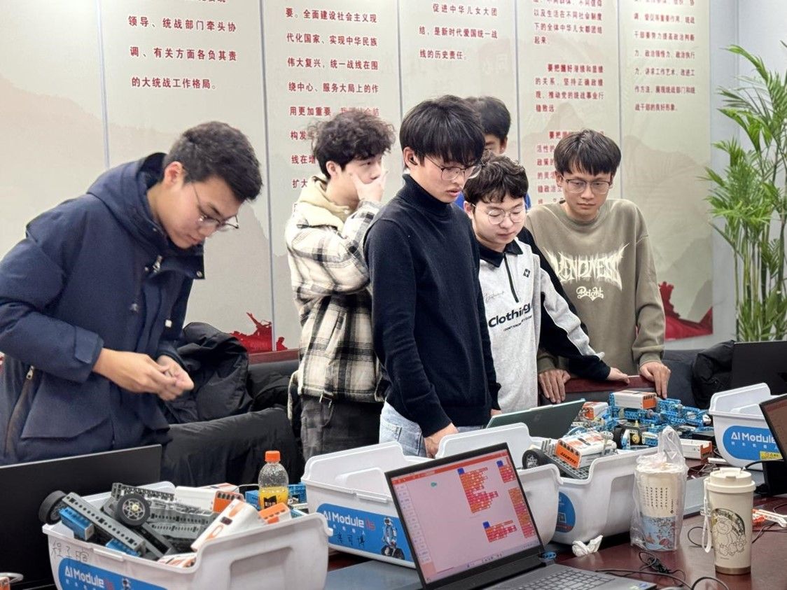活动伊始,5支参赛队伍便投入到紧张的智能车搭建与编程调试中。每组成员分工明确,有人专注硬件搭建,将主板、传感器与电机等关键部件巧妙组合;有人负责软件编程,使用活动提供的工具调试运行程序,确保智能车能够在比赛场地上稳定运行。创新空间内,大家聚精会神,尽显专注。