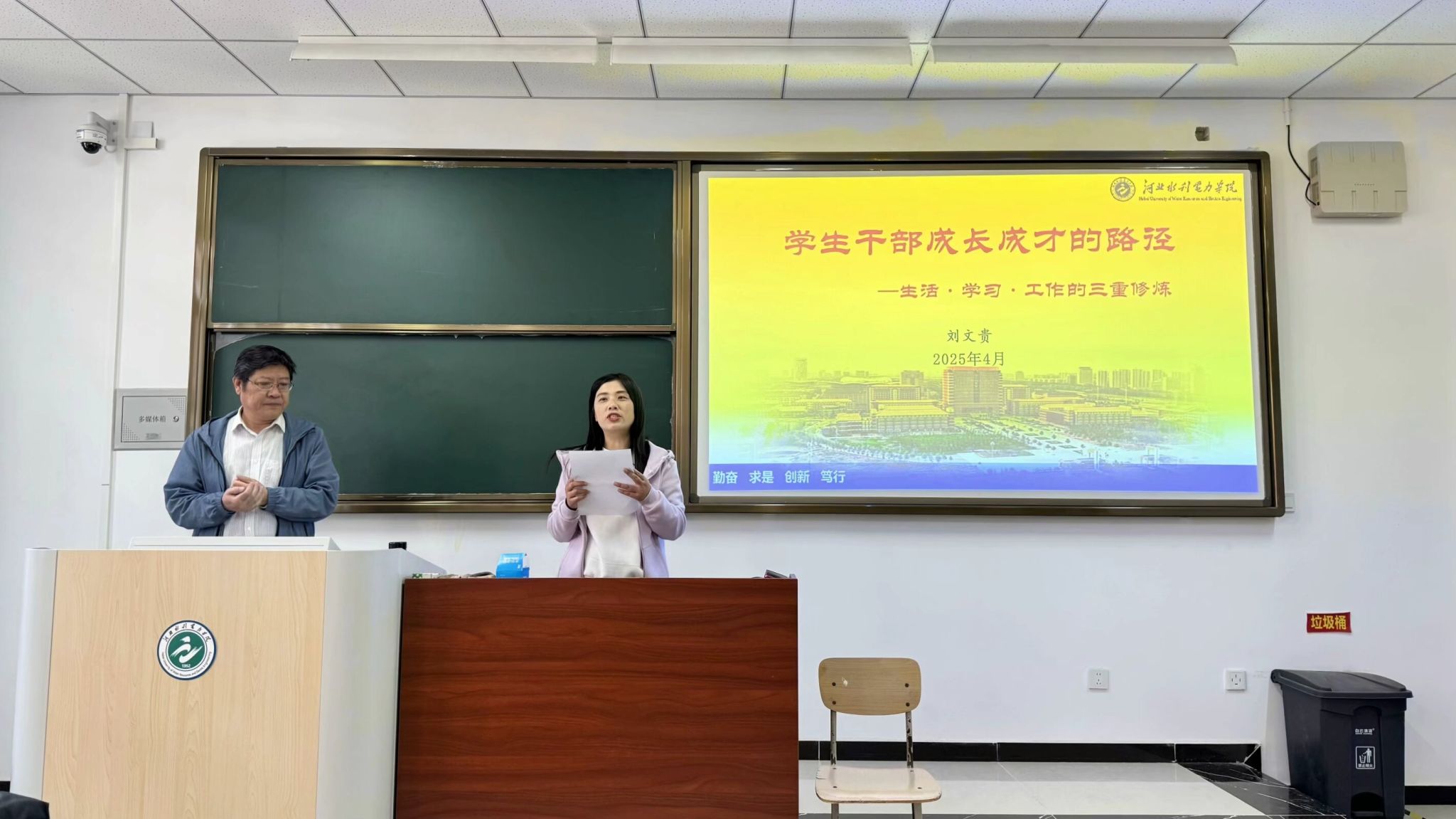 在分享会上,刘文贵教授首先强调了学生干部应服务同学,放低身段。紧接着围绕六个方面从生活上为学生干部指明道路。他提出大学生要在大学四年培养“一种技能、一种兴趣、一种人格魅力”。他指出,掌握一项专业技能是立足之本,能够在工作和学习中发挥独特价值;培养一种兴趣爱好,有助于丰富精神世界,缓解压力;而塑造人格魅力则是凝聚同学、发挥引领作用的关键,鼓励学生干部们在日常点滴中不断打磨自己,全面提升综合素质。