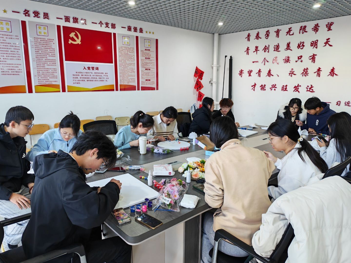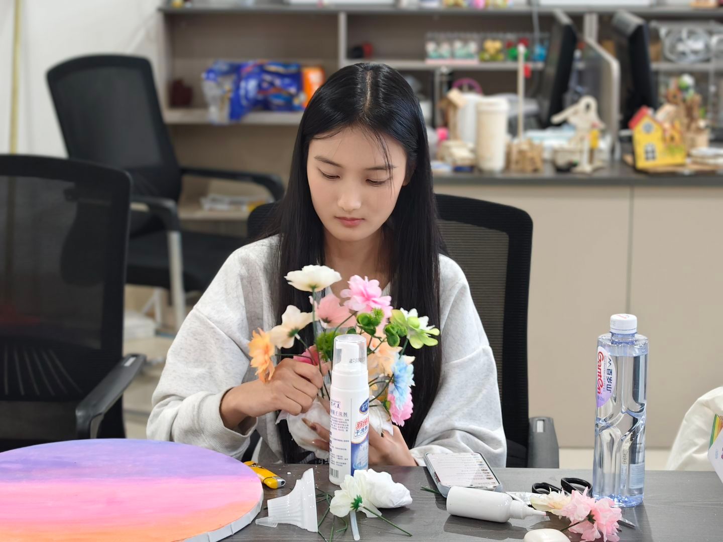 活动伊始,主持人为大家讲授了立体插花的基本知识,从色彩搭配、构图设计等审美基础,到构筑轮廓、修剪花材、搭配高度等具体操作,并在主持人的引导下,大家领取材料、构思作品。随后,大家以小组为单位展开实践创作,围绕活动主题充分交流思路,分享各类花材的适配场景。在搭配过程中,老师针对同学们的作品给予耐心指导。经过不断的调整,最终呈现出既美观又富有创意的插花艺术作品。