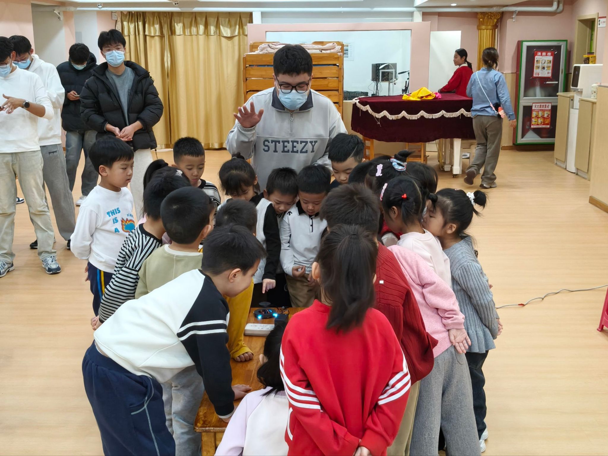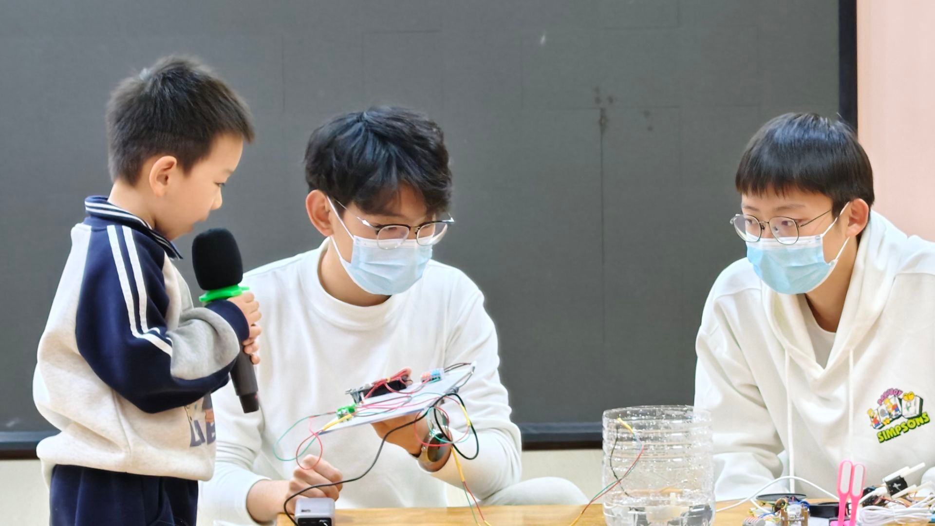活动现场,志愿者们化身“科技小老师”,结合幼儿的认知特点,用生动有趣的语言介绍了手工自制的简易模型、通过“声控喷泉”“感应电动门”等趣味模型,让小朋友们更直观地感受科学的神奇,志愿者们还现场演示了模型的操作方式,手把手教小朋友们触发声控喷泉涌动、挥手触发电动门开合。孩子们围在志愿者身边,不时举手提问,还有小朋友主动尝试操作模型,现场互动氛围热烈。