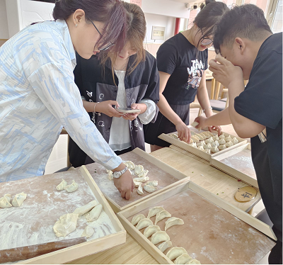 饺子制作劳动竞赛现场,参赛选手各就各位后,比拼正式开始,和面、擀面皮、放馅、包饺子一气呵成。比赛竞争激烈,选手们个个使出看家本领,一手拿皮,一手放馅,流畅地将饺子皮捻起,一盘盘形态各异的饺子脱颖而出,看着亲手包出的饺子整齐地摆放在一起,大家露出满意的笑容。比赛结束后,同学们秉持着不浪费每一粒粮食的选择,将自己包的饺子与别人分享,边品尝饺子边交流心得,欢声笑语不断。