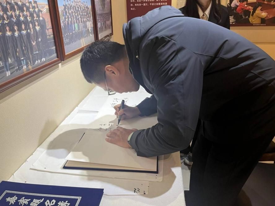 参观结束后,校友们在祝福帖上留下自己的笔迹,多位校友在签名册上写下对母校的深情寄语与签名。随后,全体人员在校史馆前合影留念,记录下这一难忘时刻。