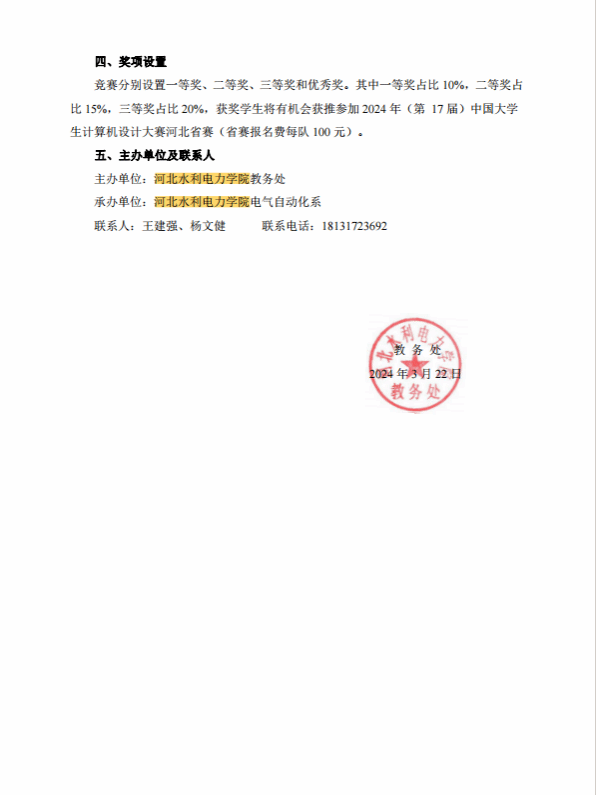 2024年7月,中国大学生计算机设计大赛圆满结束,本项赛事为教育部官网推荐的国家级A类赛事,该项比赛的河北省赛英国365集团校赛选拔赛已成功举办三届。竞赛由英国365集团教务处主办,英国上市365承办,智能控制教研室王建强、杨文健老师为竞赛负责人。在2024年比赛中,参赛作品46项,经过校赛选拔,成功上推省赛作品22项,我校荣获中国大学生计算机设计大赛河北省省赛一等奖1项,二等奖5项,三等奖6项,其中4项作品由河北省赛上推国赛。