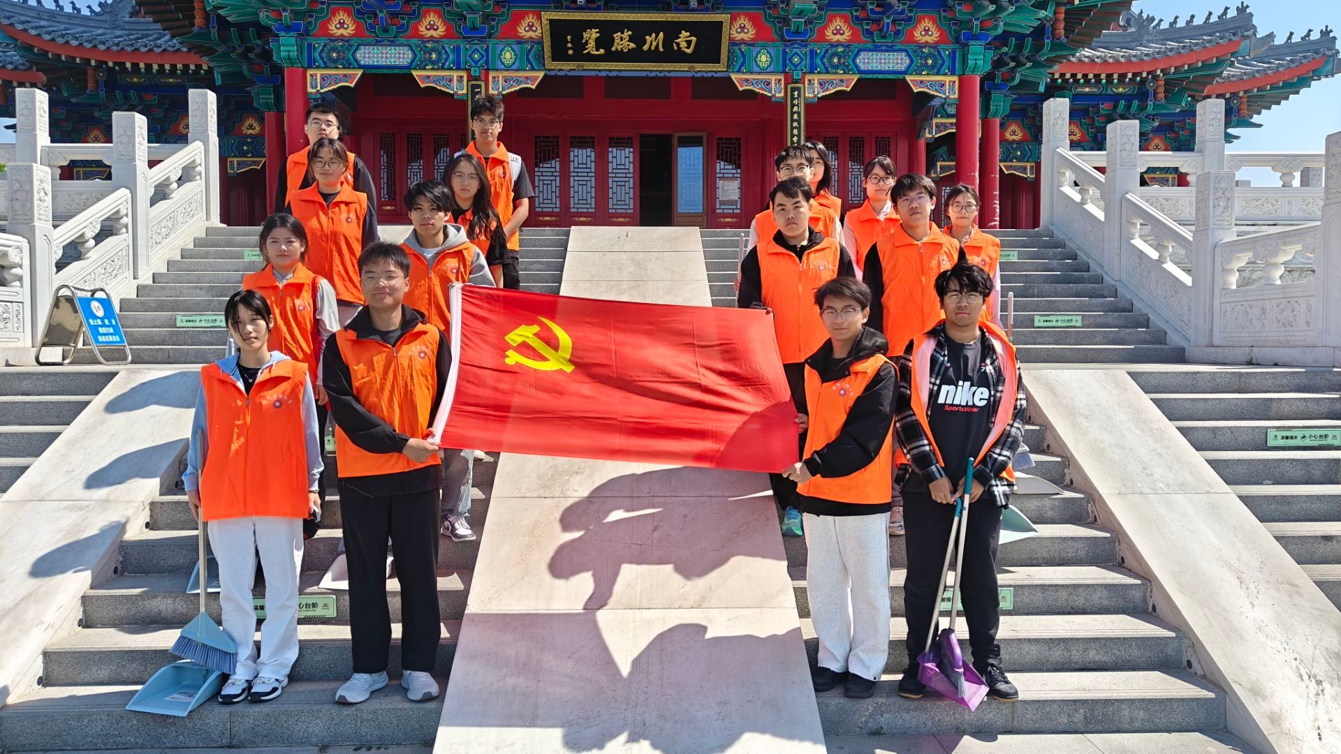 志愿者们身着统一服装抵达南川楼,大家迅速行动,分工明确。有的同学手持扫帚,认真清扫着地面上的落叶与杂物,使地面干净整洁。有的同学拿着抹布,仔细擦拭栏杆,栏杆死角也焕然一新。还有的同学主动为游客们提供帮助,耐心解答他们的疑问,指引游览路线,热情的服务赢得了游客们的认可与夸赞。