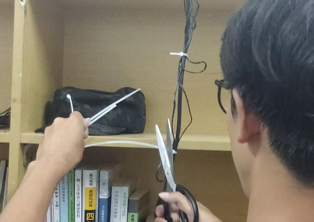 活动当晚,志愿者们带着捆线工具来到新生宿舍区。面对宿舍里交错缠绕的电线,大家先仔细梳理线路走向,再按照“分类归整、安全牢固”的原则,将电源线、数据线等不同类型电线分别捆绑。过程中,志愿者们一边认真操作,一边向新生们讲解电线杂乱的安全风险。