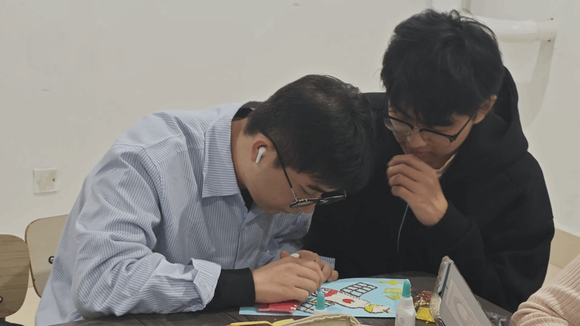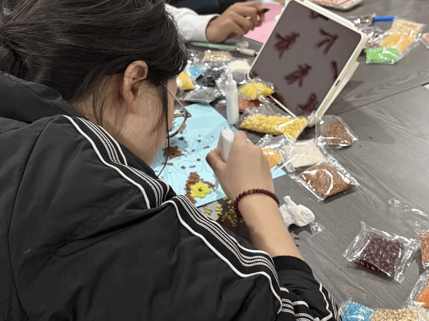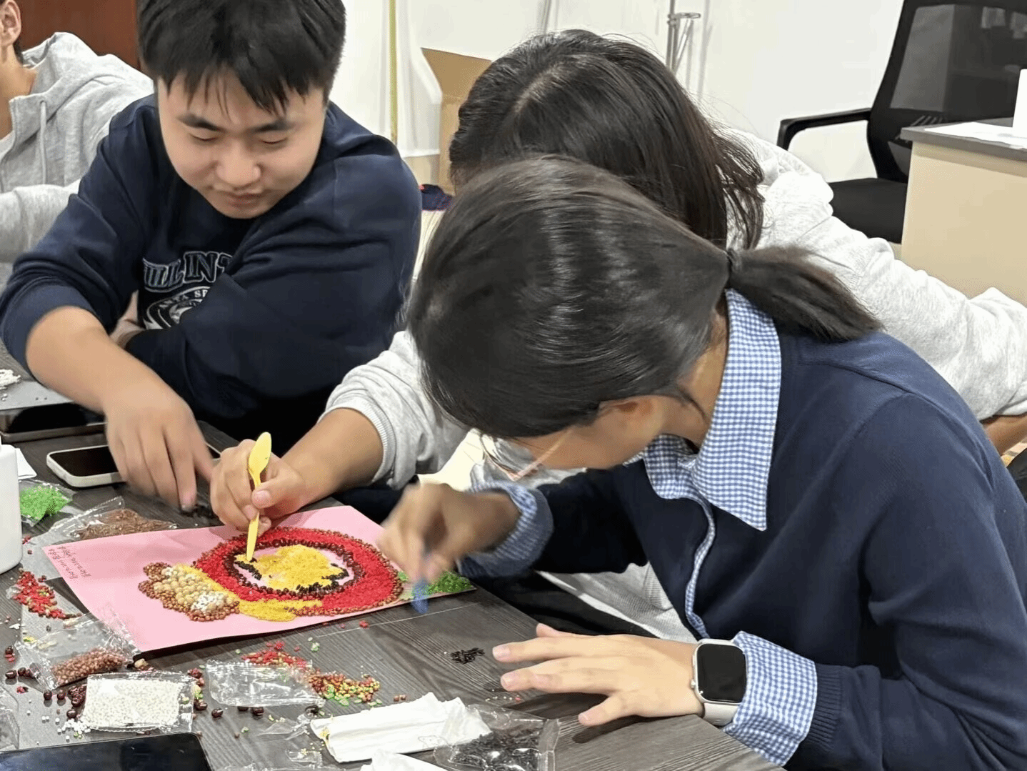 活动现场中,同学们两人一组,以谷物为笔,将手中稻谷不断粘合,创作属于自己的五谷画。用指尖巧思赋予平凡谷物之生命力。浅黄麦粒与深褐谷壳错落拼贴成“五谷丰登”,雪白大米与金灿小米组成扬帆启航的船只。同学们的每幅作品都凝聚着一丝不苟的匠心精神,彰显着青年大学生的创作巧思,同时让非遗文化展现出更具象化的视觉呈现。