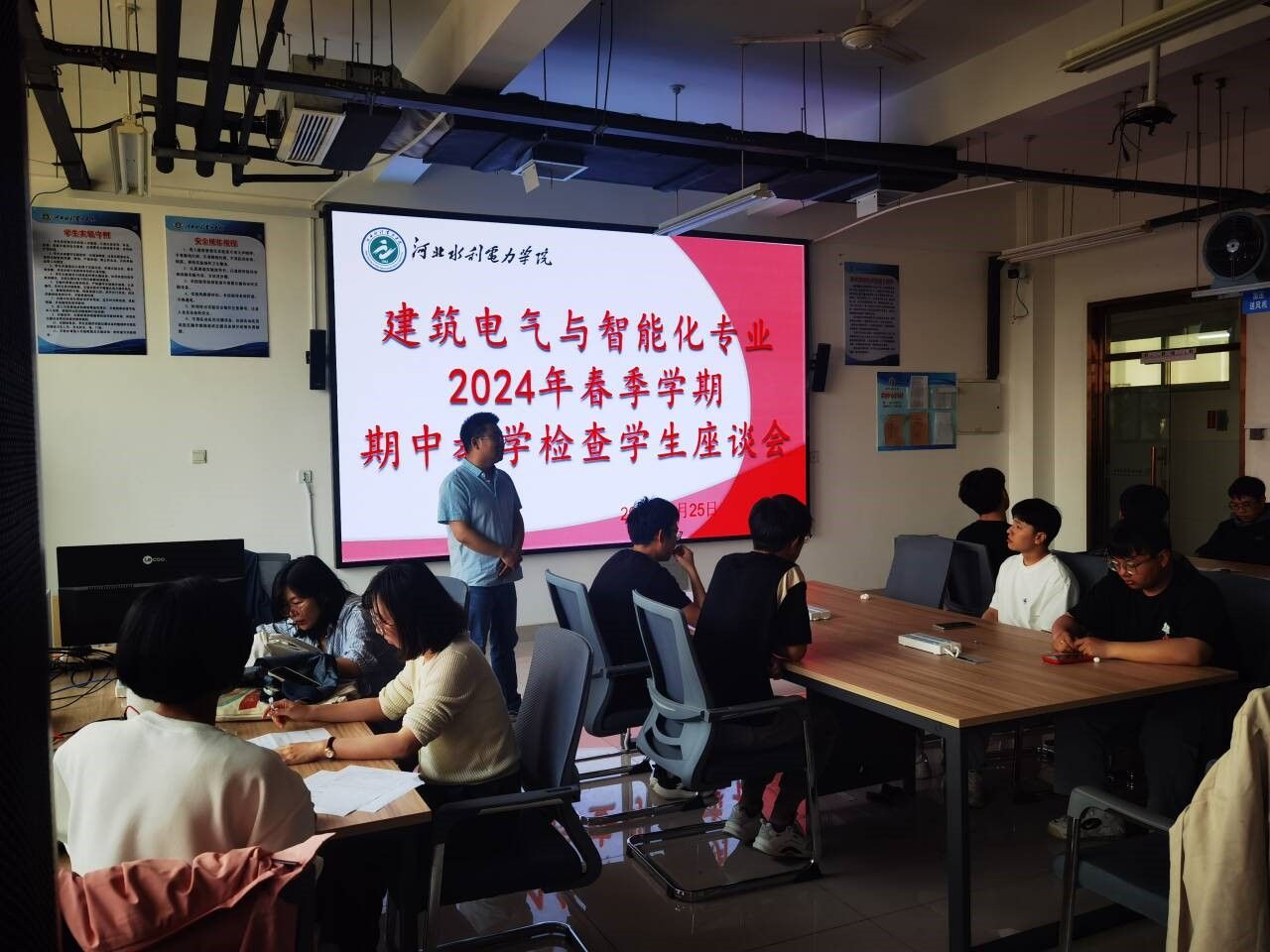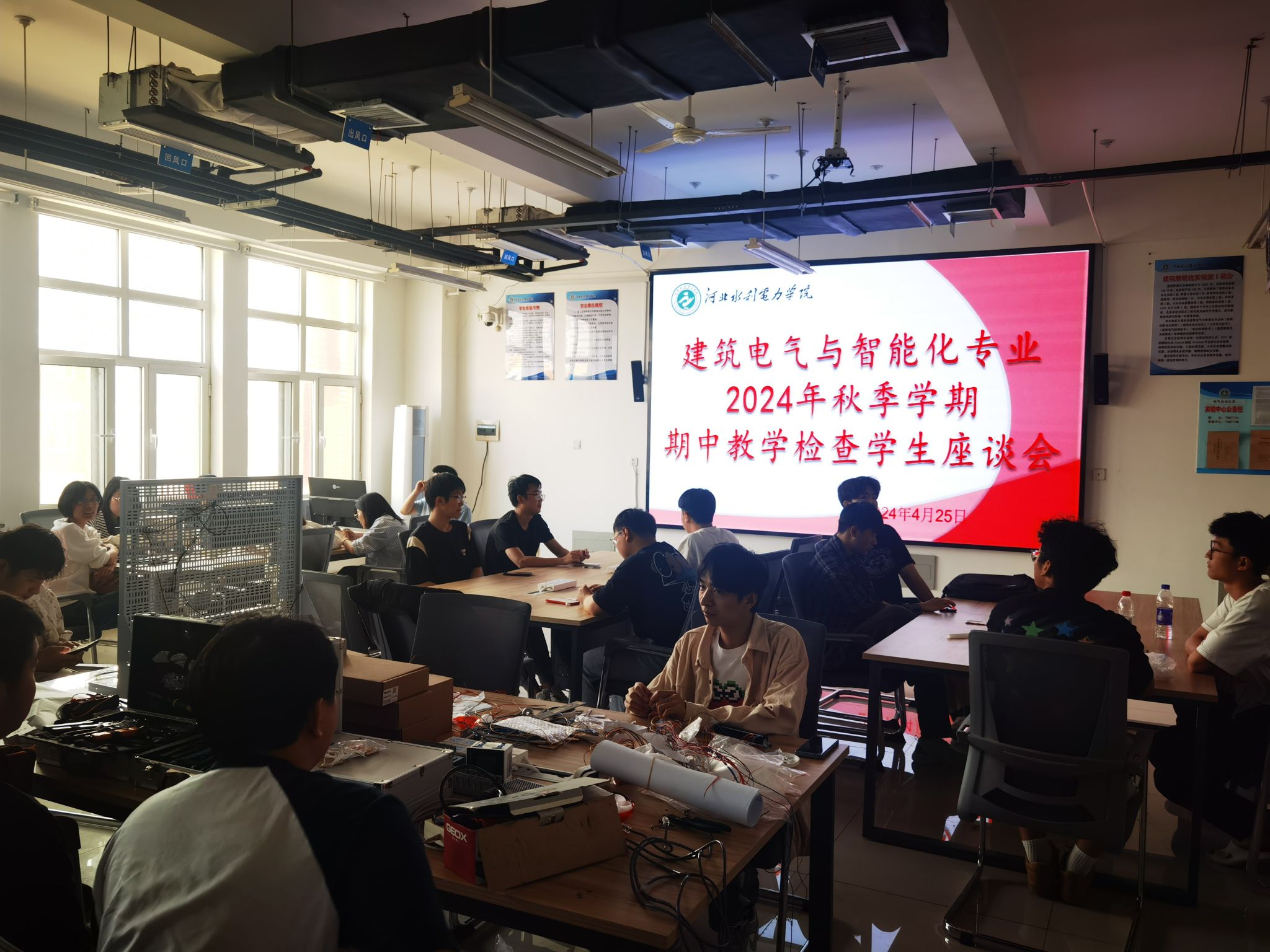 4月25日在实验楼307召开了2024年春季学期期中学生座谈会,智能控制教研室全体教师和建筑电气与智能化专业各班学生代表参加了座谈会。各位老师就学生们关心的专业方向、考研、就业、学科竞赛等问题进行了细致的回答,学生普遍反映较满意。