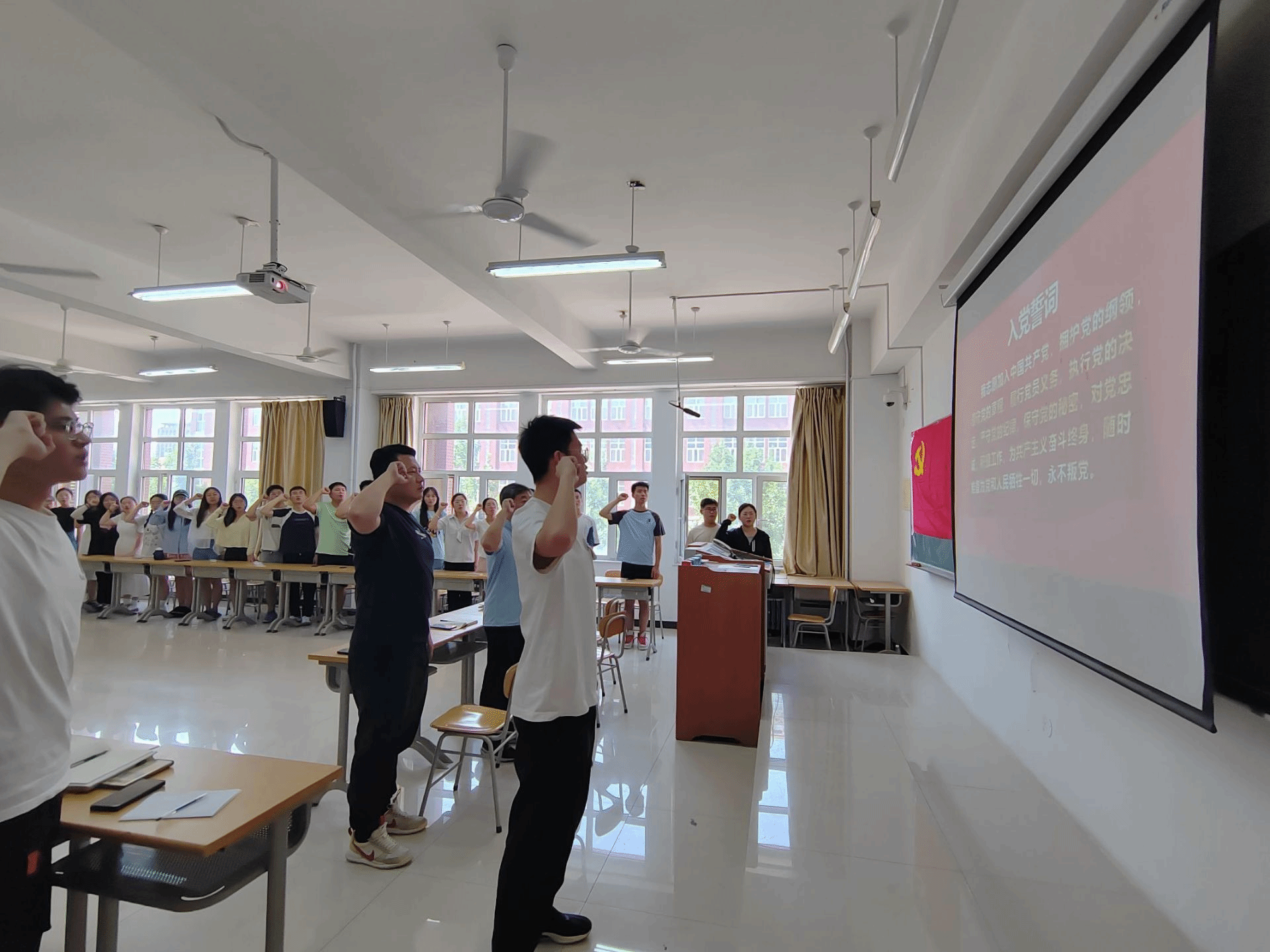 活动第一个环节,毕业生党员代表韩东序同学带领全体毕业生党员重温入党誓词,对共产党员来说,入党誓词就是座右铭,是行动指南,它表明了一个共产党人为实现自己人生最高价值所作出的无悔选择。面对鲜红的党旗,毕业生党员紧握右拳,眼神坚定,庄重严肃,回忆入党宣誓时的郑重承诺。大家纷纷表示,必将牢记入党誓词,不断以实际行动践行入党誓词,永远保持共产党员的青春活力和纯洁本色。