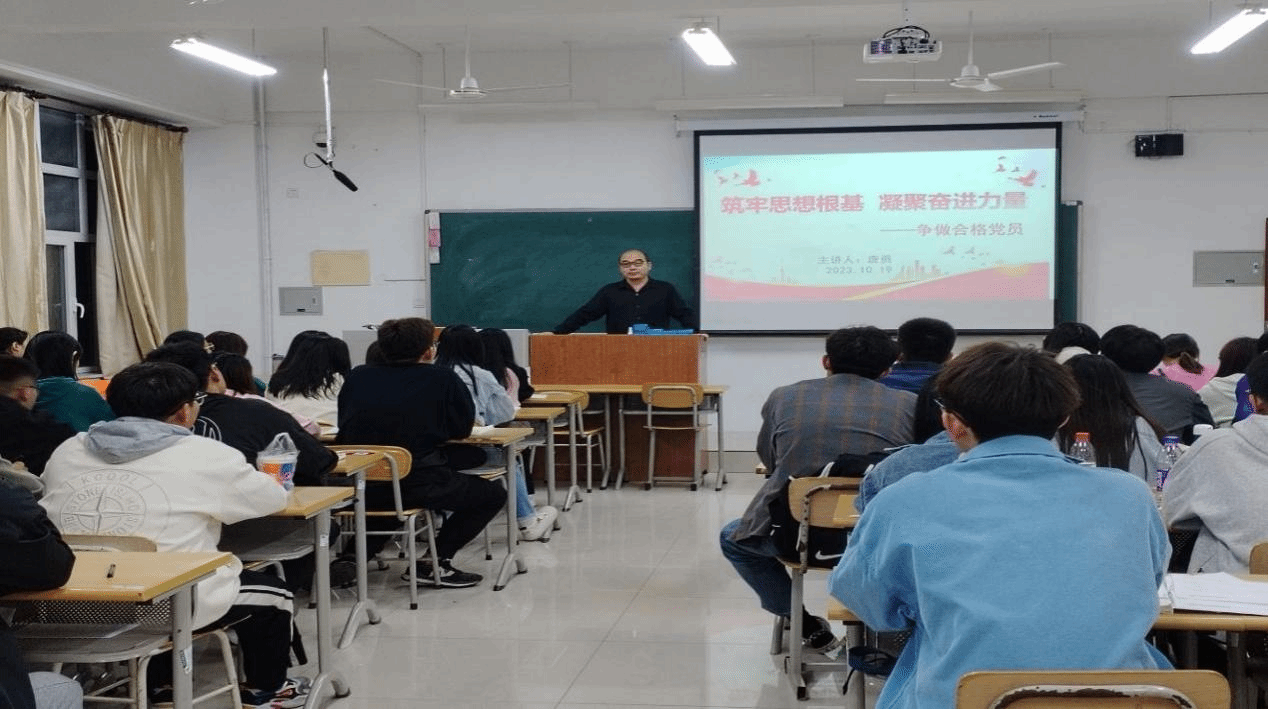 10月19日晚,系主任唐勇以“筑牢思想根基,凝聚奋进力量”为主题,围绕习近平新时代中国特色社会主义思想、党的二十大主题的深刻内涵和精神指引以及入党流程等方面进行详细地讲述。唐勇指出,每位参训学员都应提高自己的思想境界和综合素质,以高标准要求自己,收获高质量结果,并要求参训学员要进一步学习掌握党的基本知识,筑牢思想根基,端正入党动机,切实提高理论水平和政治素养,在学以致用中坚定理想信念,不断向党组织靠拢。